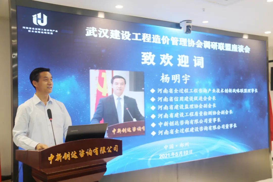 2021年5月10日下午,武漢建設工程造價協會顧問、湖北省造價協會副會長汪國剛,湖北省造價協會副會長、中德華建(北京)國際工程技術有限公司董事長汪建新,海天咨詢董事長韓江濤一行9人到聯盟調研交流。河南省全過程工程咨詢產業技術創新戰略聯盟理事長、中新創達咨詢有限公司董事長楊明字、中新創達咨詢有限公司執行董事徐希萍、黨支部書記董高峰、河南省全過程工程咨詢產業技術創新戰略聯盟秘書長王偉及聯盟單位代表熱情接待并組織座談會。