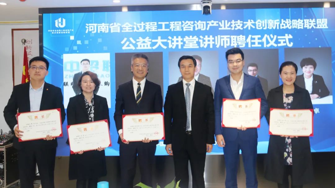 在與會人員的見證下,聯盟理事長楊明宇為北京市百瑞(鄭州)律師事務所吳彥、袁武強、閆興偉、秦玉卓律師,中招聯合信息股份有限公司河南區域副總經理鄭浩頒發全過程工程咨詢公益大講堂講師聘書。